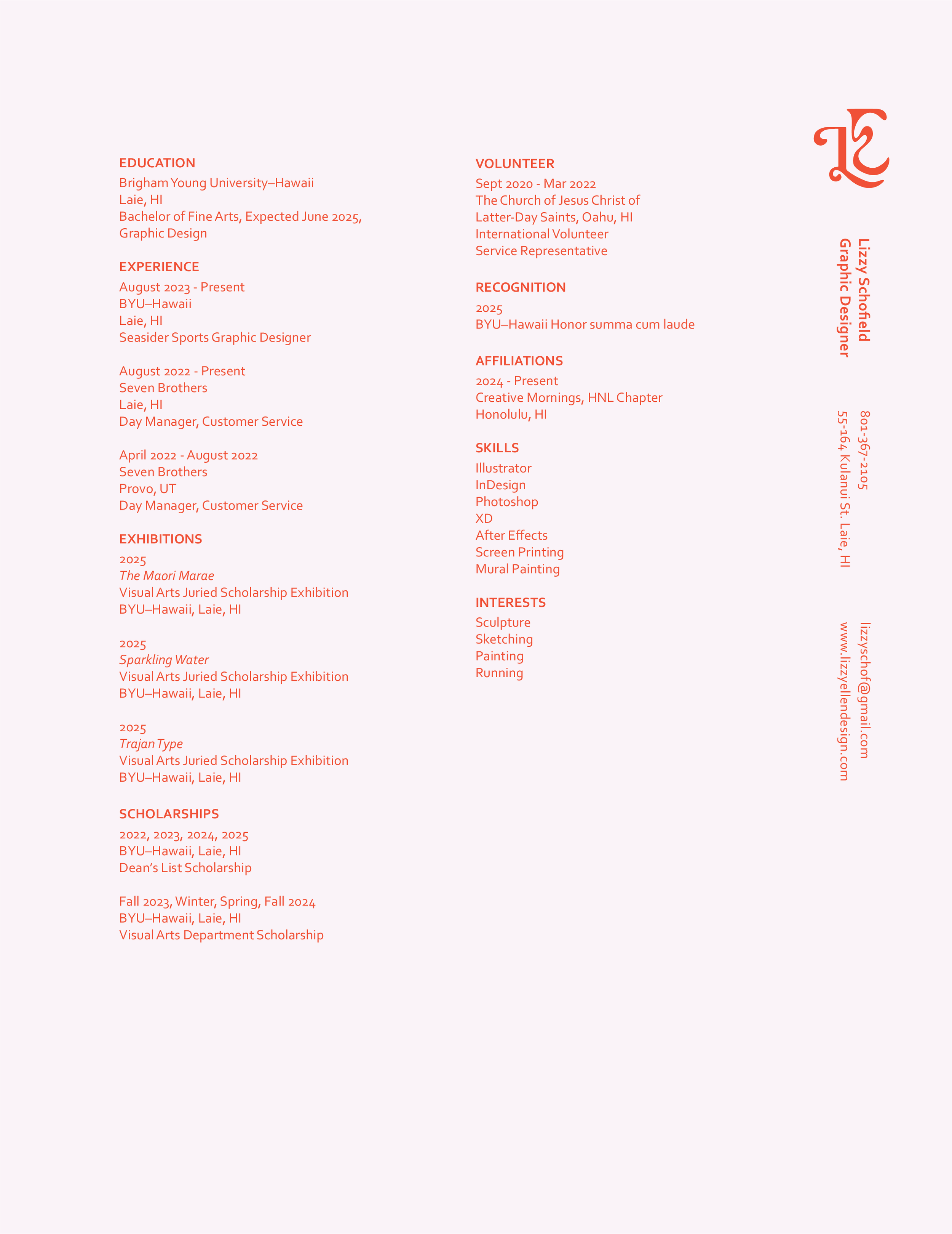 After Covid hit, a year into college in Utah, I felt a new desire to serve a volunteer mission for my church. I was called to Hawaii which greatly expanded my love for design and creativity. So much so that I decided to return to finish my schooling and earn my BFA in Graphic Design. Hawaii and its people have completely changed me. I have never loved people more. I have never loved a place more. And I have never loved design more. I have a passion for creating anything physically, that is printable, but I also love app and logo design.